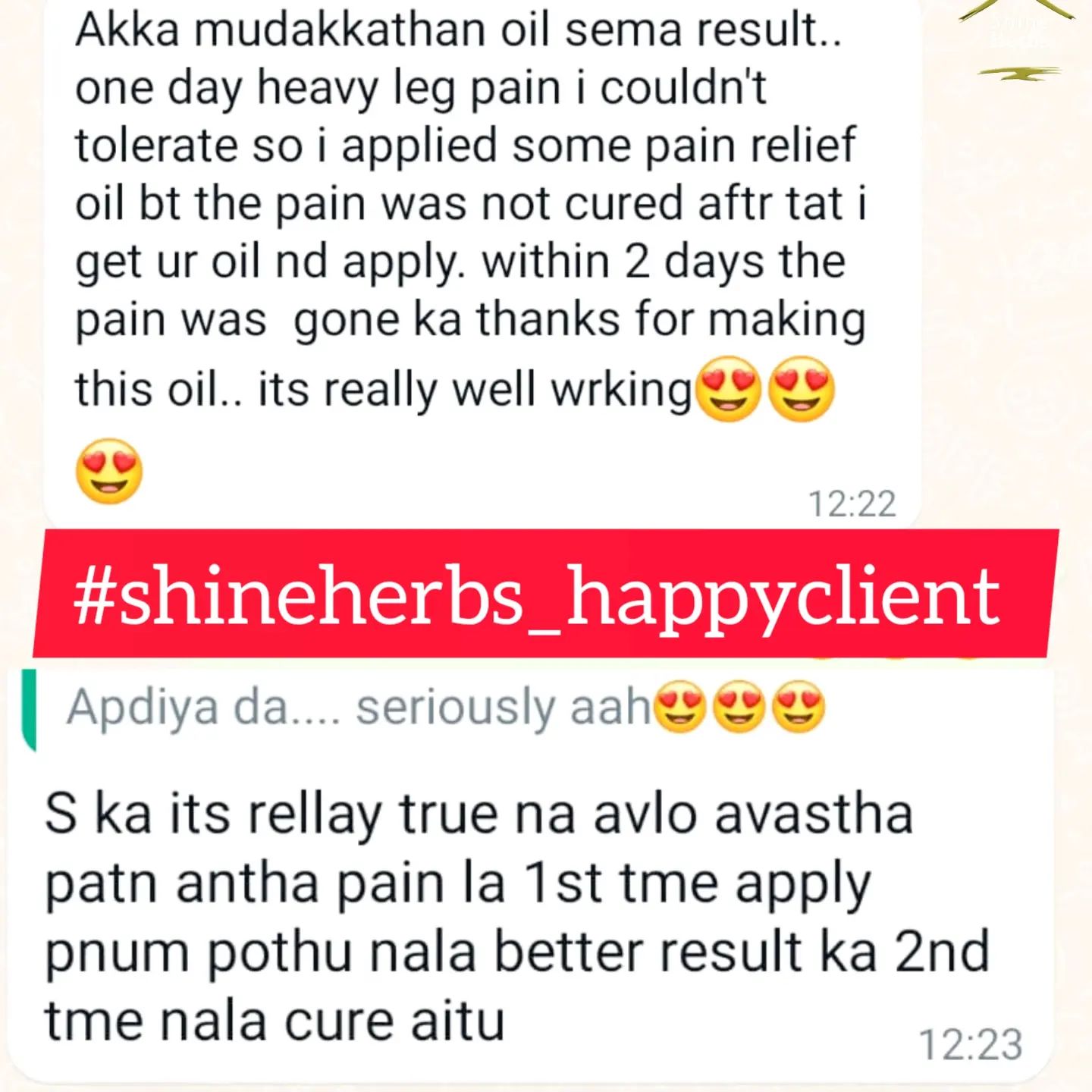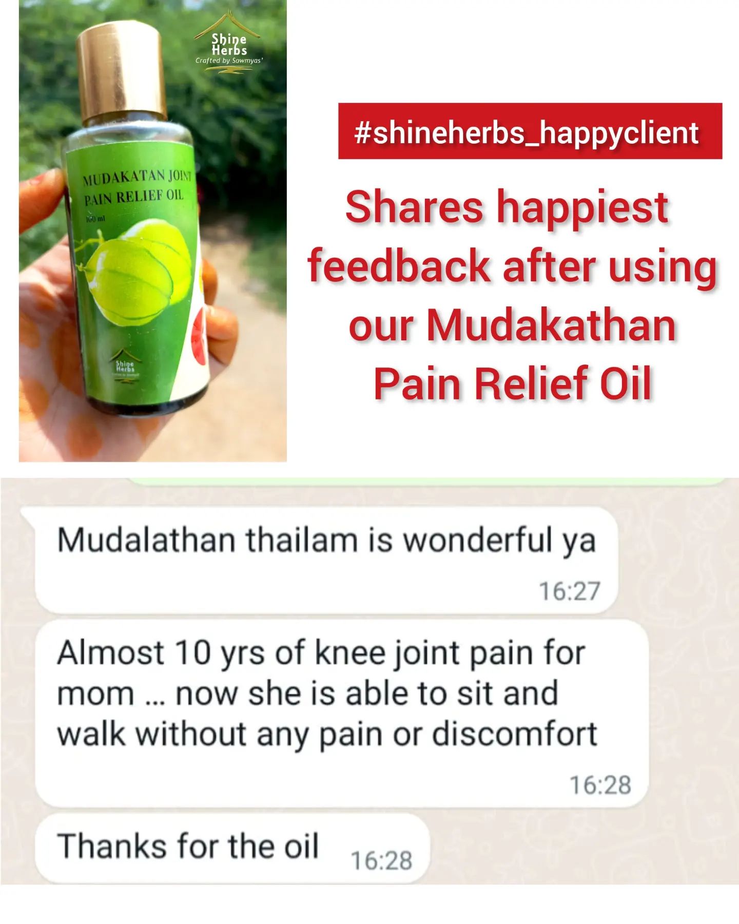 We from Shineherbs, curated an authentic pain relief oil which removes inflammation on your joints and gives relief from muscle soreness, pain and helps you move around pain free. This mudakathan pain relief oil is made of bunch of balloon vines or mudakathan leaves, pirandai, cloves, garlic, cinnamon and few more ingredients which work together when infused and curated to deliver an complete pain relief oil... Many customers who have once been skeptical to try this pain relief oil are already enjoying their holy trip to bhadrinath and kedarnath along with their partners and companions. And we are equally blissed to see smiles in 100's and 100's of people to have completely relieved from pain and this oil is already a travel companion to many bikers and elders.